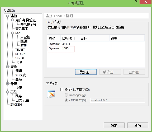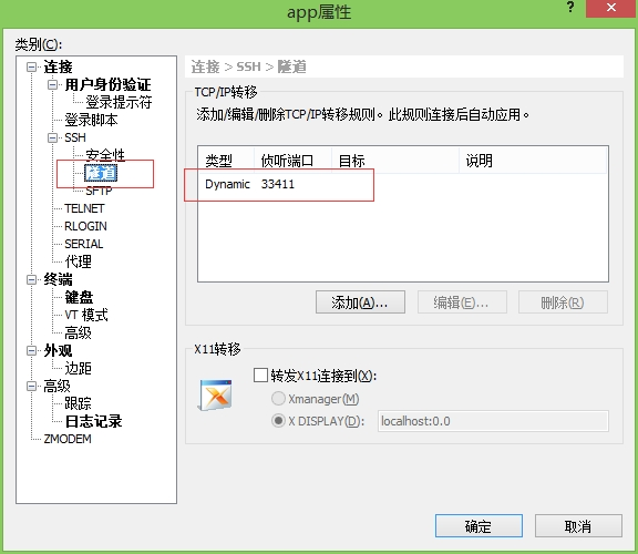 打开 SSH 连接属性窗口,选择隧道(下图已经添加成功一个)
