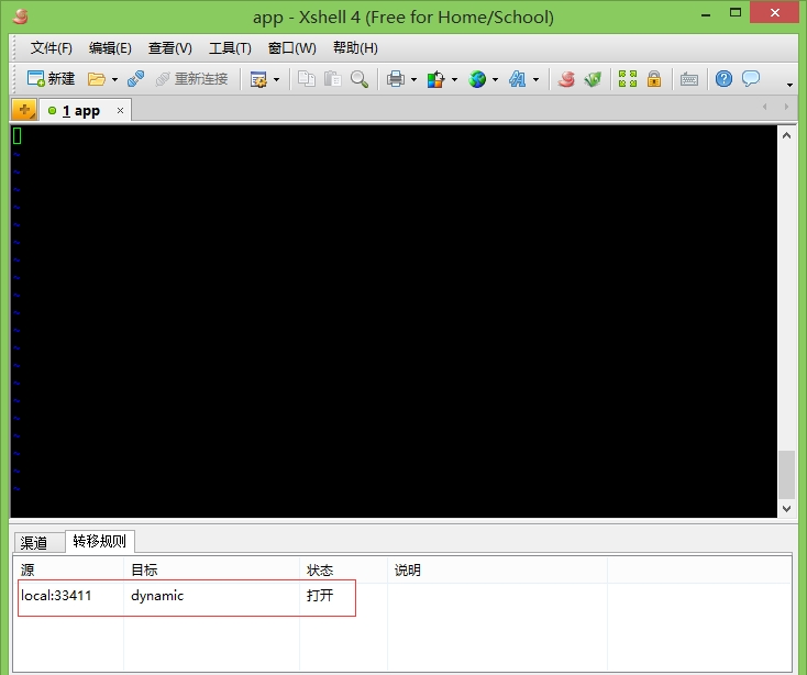 说明:源主机是请求端远程服务器主机地址(任何可访问服务器的 IP 或域名均可),侦听端口必需为当前服务器未占用端口(最终 Xshell