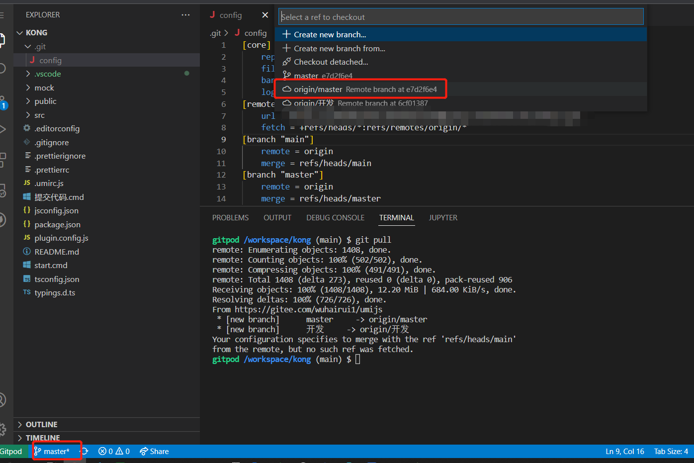 然后使用 git pull 命令将代码 pull 下来,切换到 master 分支即可。