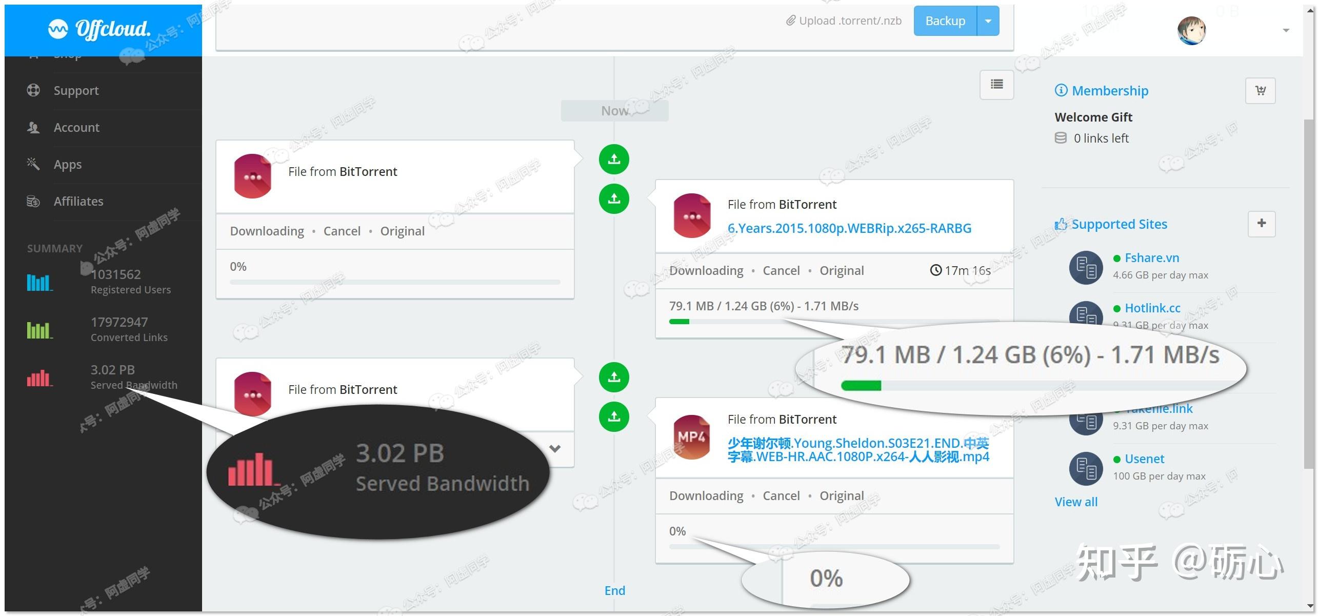 OffCloud 其服务器上已有 3.02PB(1PB=1024TB)的资源,不过就算如此,我尝试离线下载了一个国内的美剧资源,依然没速度☹