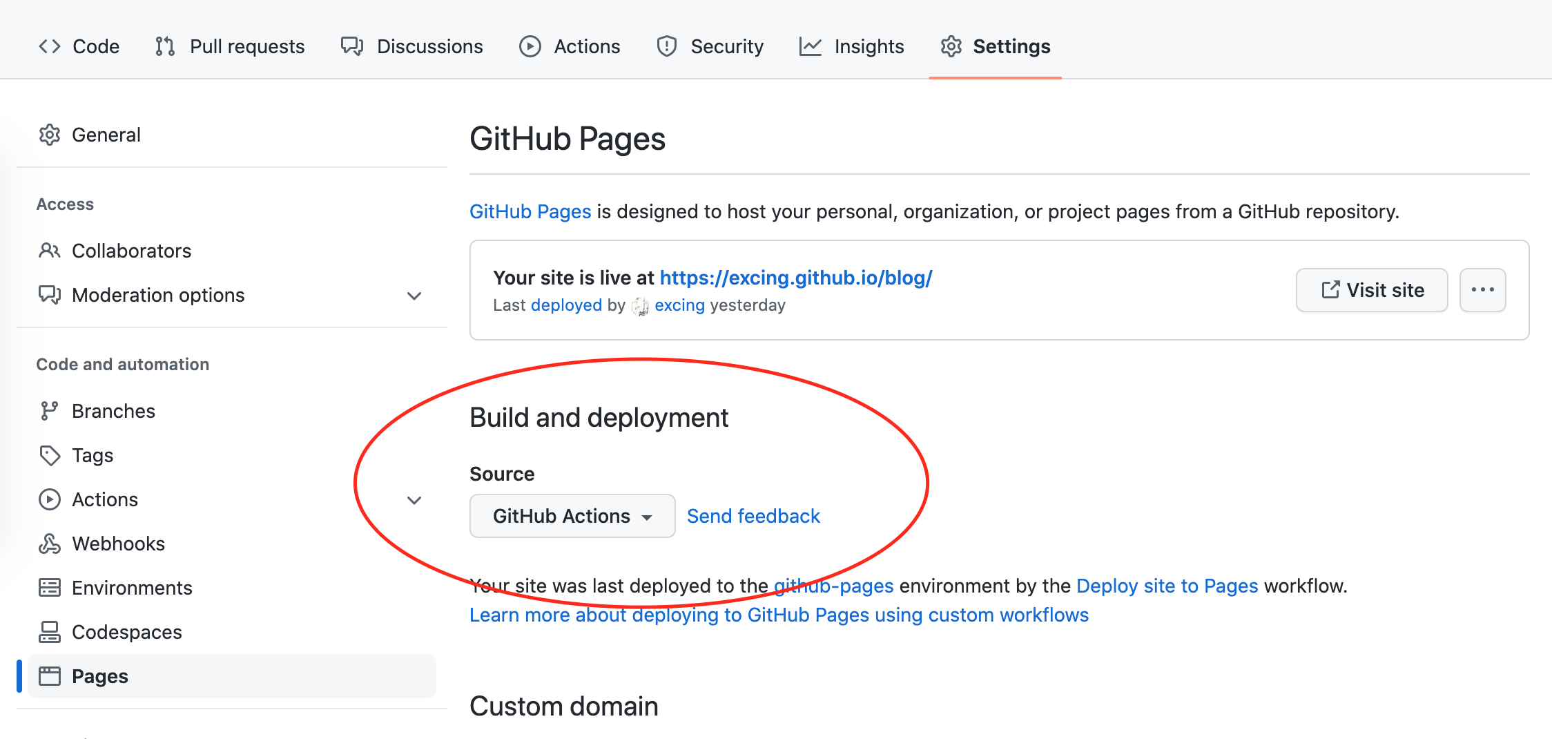 在 Repository 的设置页的左边栏里,点击Pages 菜单,进入 GitHub Pages 页面。然后设置 Build and deployment 的 Source 为 Github Actions(workflow 里面用到了发布到 GitHub Pages 的框架和自定义构建过程)。